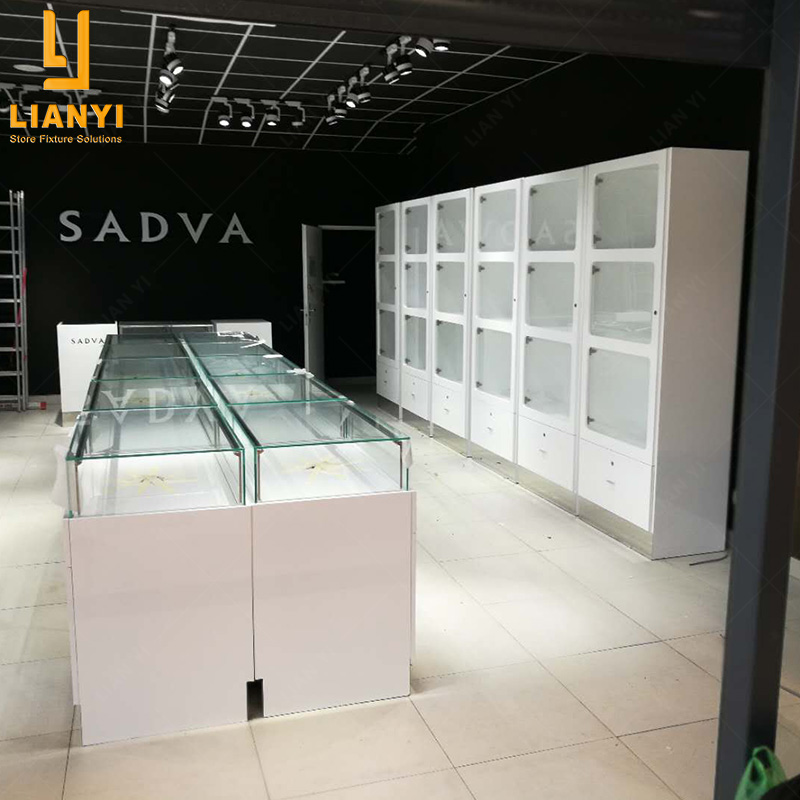 The whole jewellery shop fittings are simple line and structure from modern style. The lower part of the jewellery showcase cabinets are made by wood, with pure and clean surface treatment, which makes people feel simple and fashion. Pull out drawer design with locks. The jewellery showcase also has eye-catching logos with acrylic luminous logos in the design to increase the brand effect.
