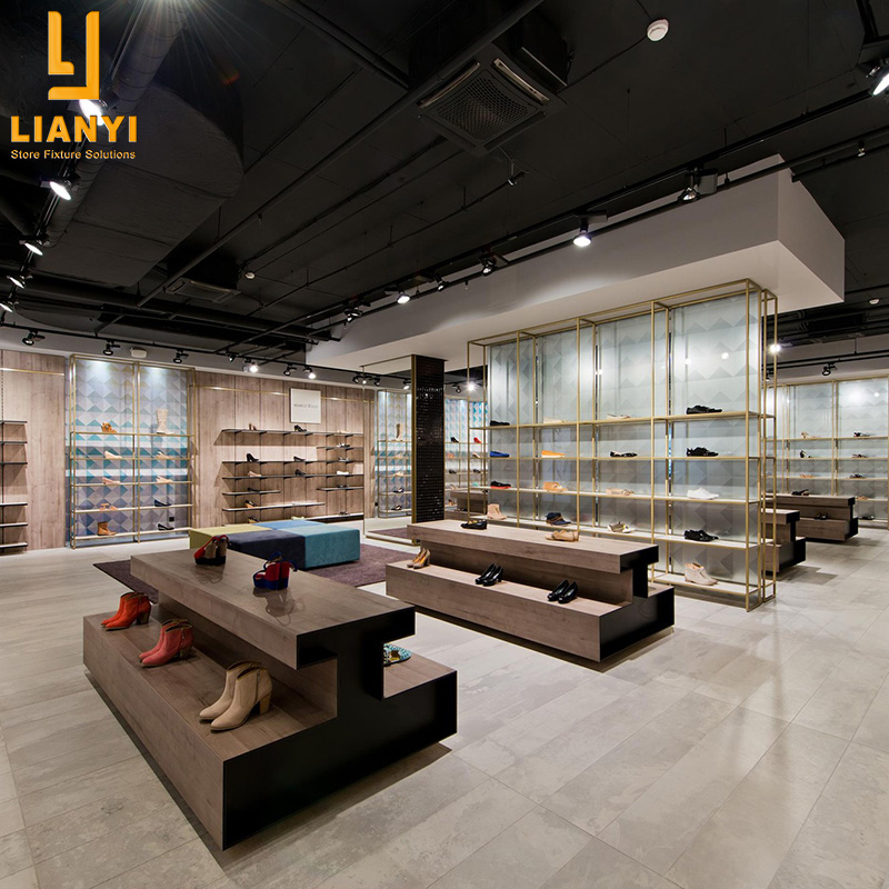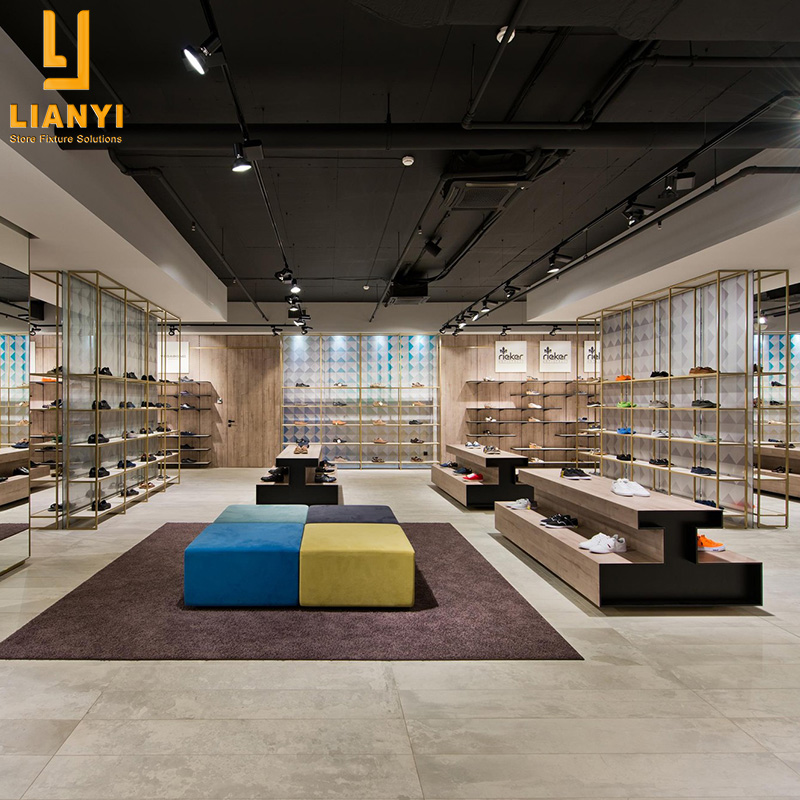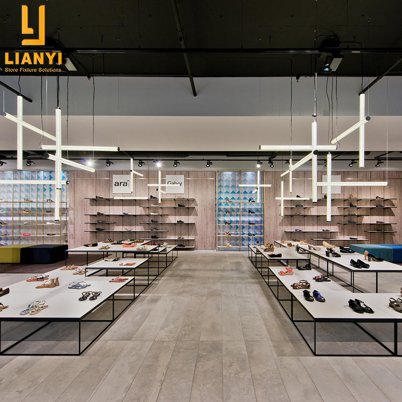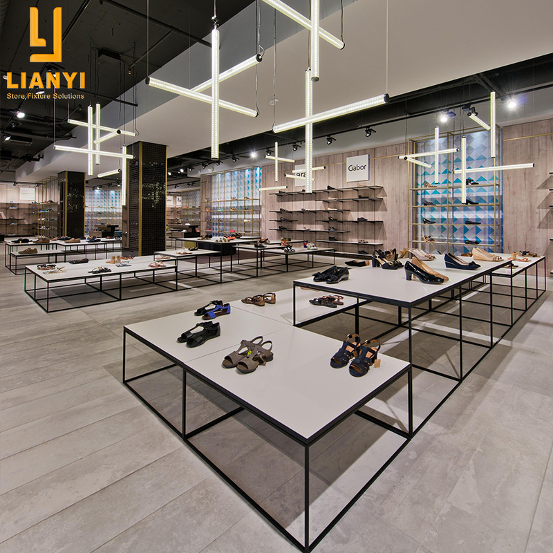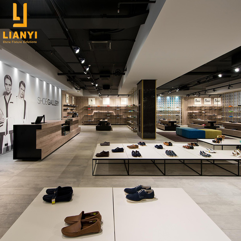 Different display furniture is placed according to the layout of the shoes retail shop. So first of all, we need to design the interior layout and divide each area of the store, such as display area, storage area, try-on area, checkout area. Then you can give us the drawings, we will improve the drawings of all store fixtures, and then put into production.